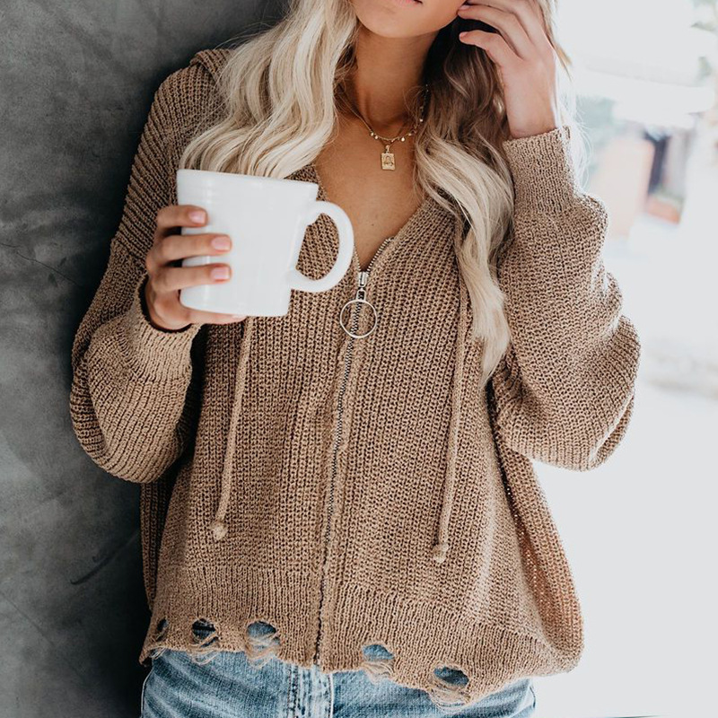 Hooded Zipper Sweater, Irregular Loose Women's Sweater